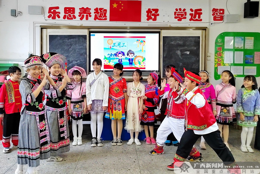 连日来,百色市右江区各中小学和幼儿园纷纷开展“壮族三月三“欢庆活动,营造浓浓的节日氛围。图为右江区逸夫小学的同学在对山歌。