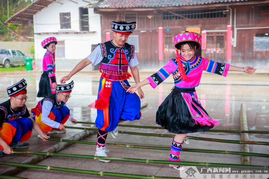 灵川县大境瑶族乡松江村倘竹坪屯,瑶族同胞们身穿节日盛装,开展跳竹竿、对山歌等活动,欢度“壮族三月三“。石玲 龚炳旭 摄