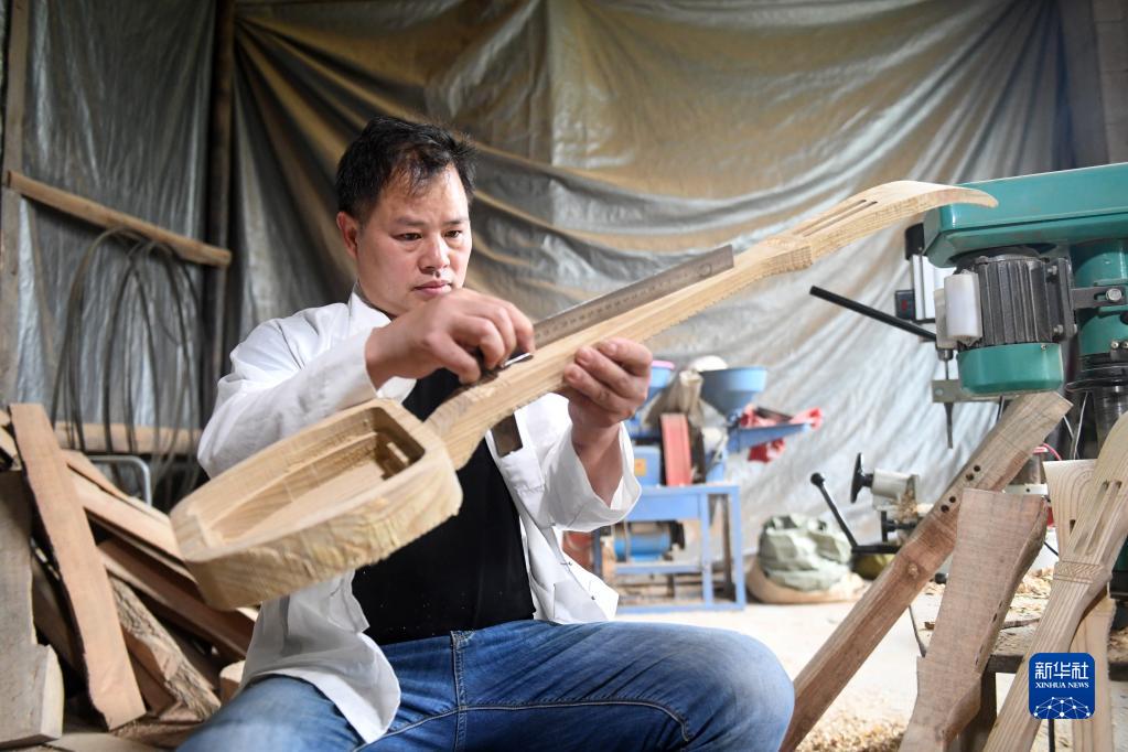 6月15日,在广西三江侗族自治县林溪镇冠洞村,杨龚在工作间内制作侗族琵琶。