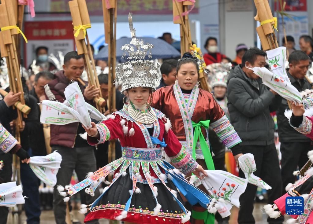 2月2日,融水苗族自治县杆洞乡党鸠村苗族同胞进行芦笙踩堂。