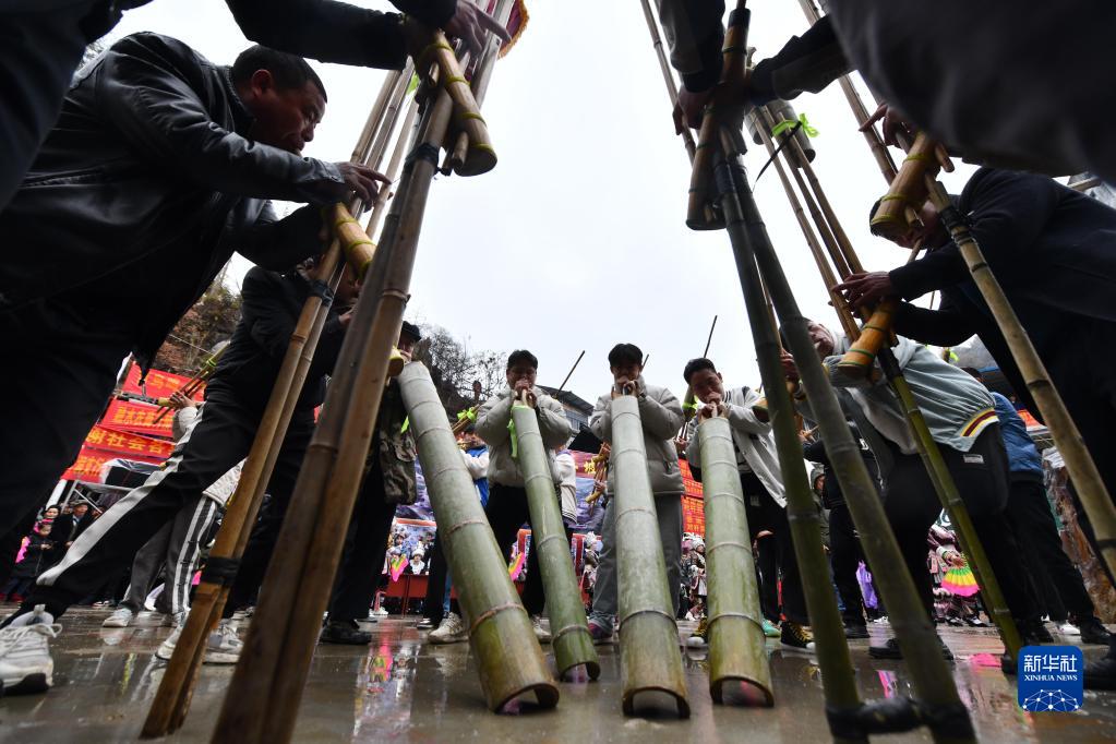 2月2日,融水苗族自治县杆洞乡各族群众在吹奏芦笙。