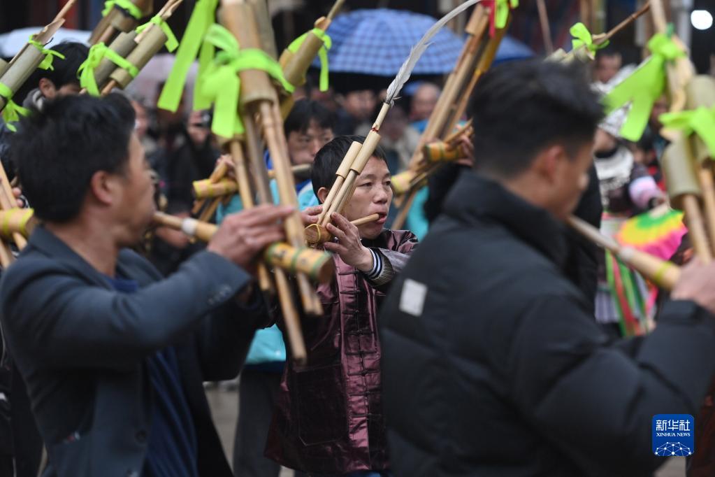 2月2日,融水苗族自治县杆洞乡党鸠村苗族同胞在吹芦笙。