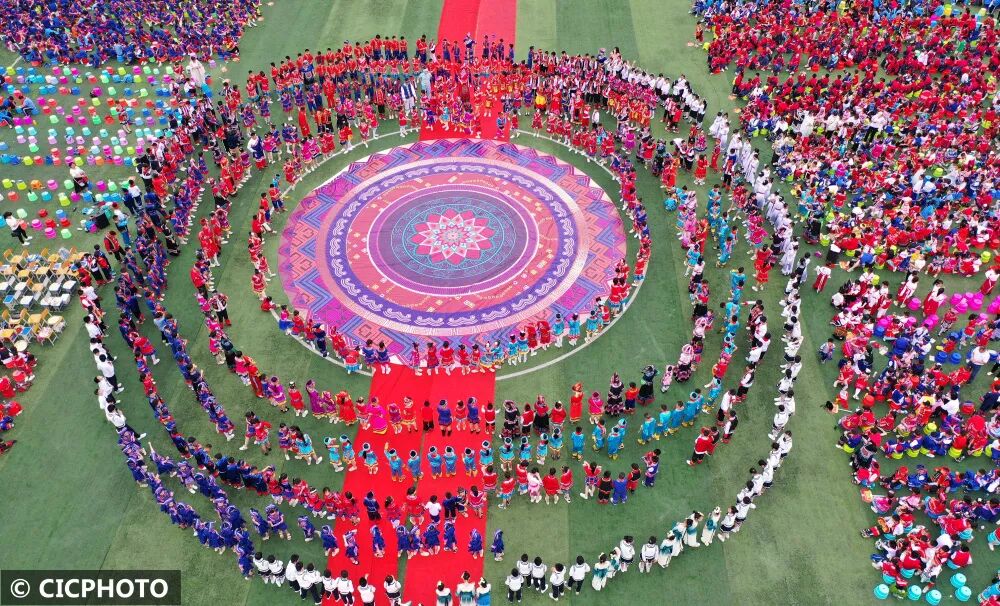 2023年4月20日,在广西崇左市扶绥县“民族团结我同行 各族师生一家亲”民俗文艺汇演活动中,新宁镇第三小学师生同跳民族舞。(无人机照片)