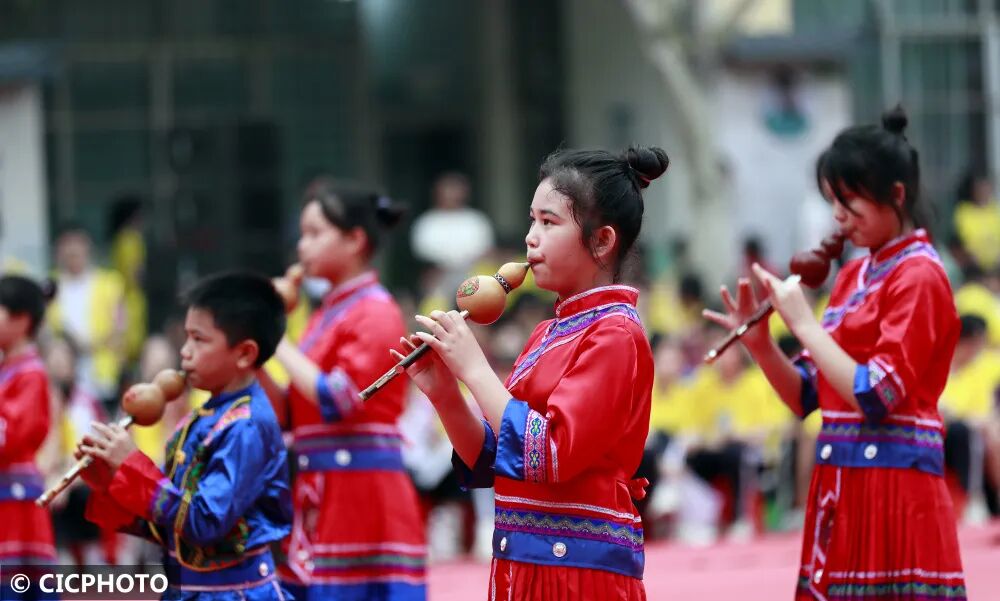 2023年4月20日,在广西崇左市扶绥县“民族团结我同行 各族师生一家亲”民俗文艺汇演活动中,新宁镇第三小学学生表演葫芦丝合奏《我要谢谢你》。