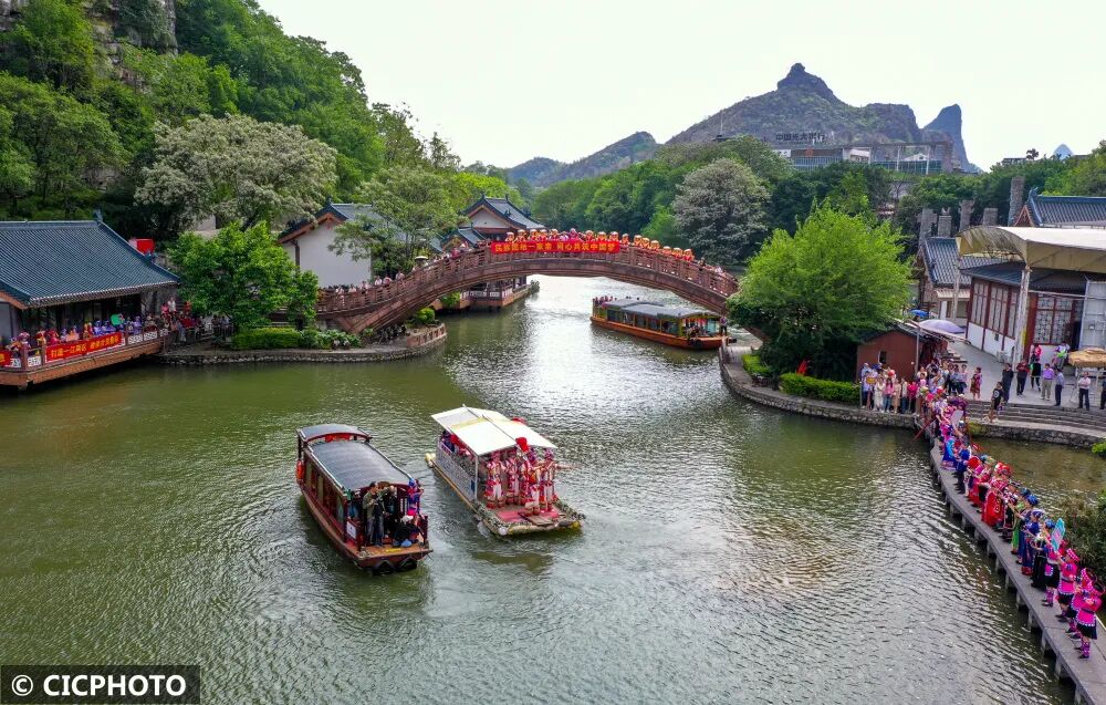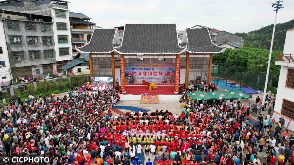 2023年4月22日,广西柳州市融安县板榄镇,当地各族同胞在参加“三月三”传承民俗文化山歌节活动。(无人机照片)