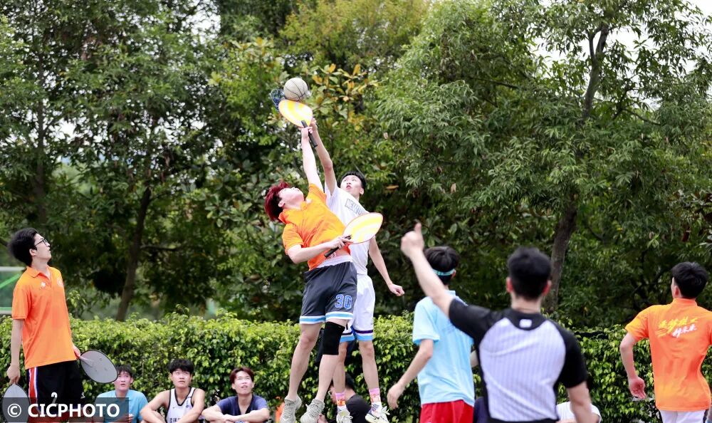 2023年4月18日,广西崇左市扶绥县,在桂林理工大学南宁分校第三届少数民族传统体育运动会上,大学生进行珍珠球比赛。