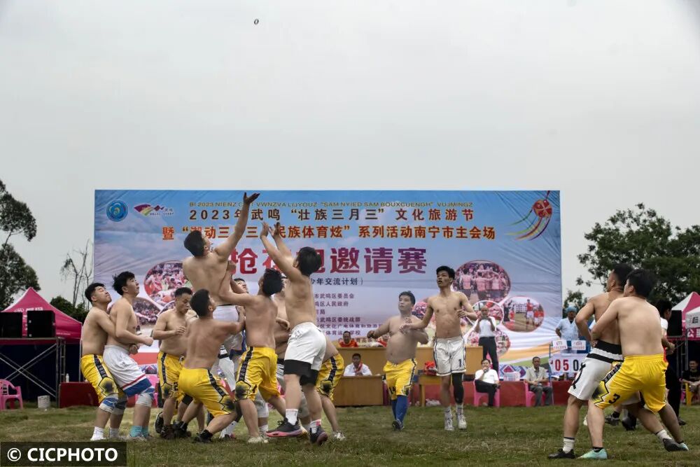 2023年4月22日在广西南宁市武鸣区拍摄的“壮族三月三”抢花炮比赛现场。