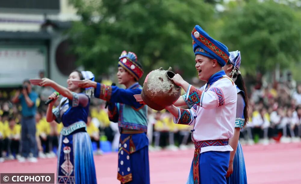 2023年4月20日,在广西崇左市扶绥县“民族团结我同行 各族师生一家亲”民俗文艺汇演活动中,未来城小学老师在龙华中学表演歌舞《甜乡敬酒歌》。
