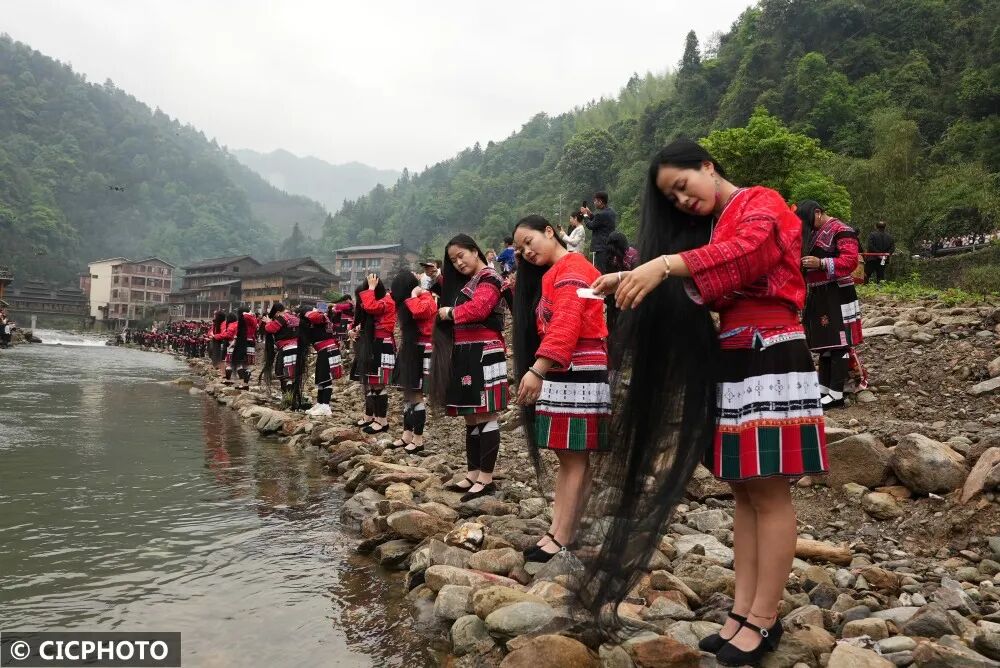 2023年4月22日,广西桂林市龙胜各族自治县龙脊镇黄洛瑶寨,瑶族妇女在河边梳理长发。黄洛瑶寨的红瑶族妇女有世代相传的蓄发习俗,当日,黄洛瑶寨举办“长发节”,欢庆“三月三”。