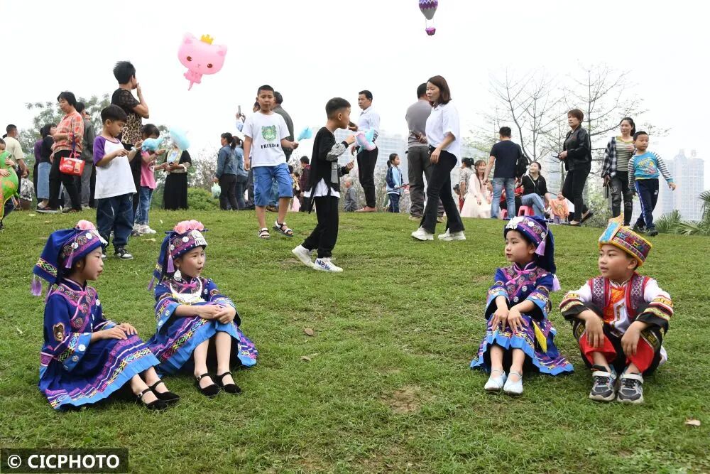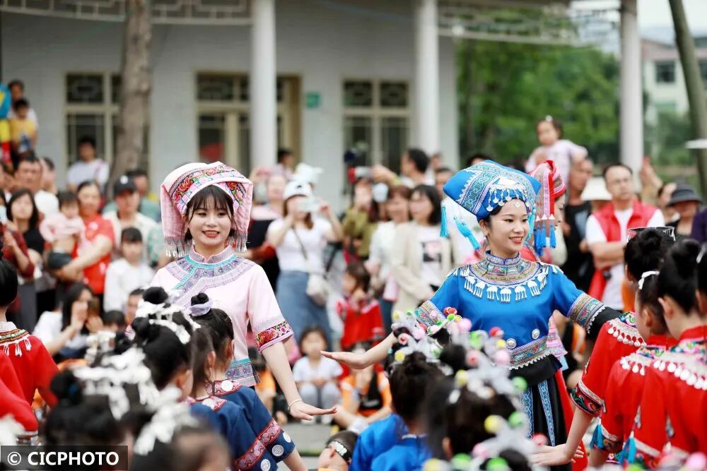 2023年4月21日,广西柳州市融安县长安镇大洲村,身着节日盛装的少数民族同胞在参加“壮族三月三 桔乡唱欢歌”民族风情文艺演出。