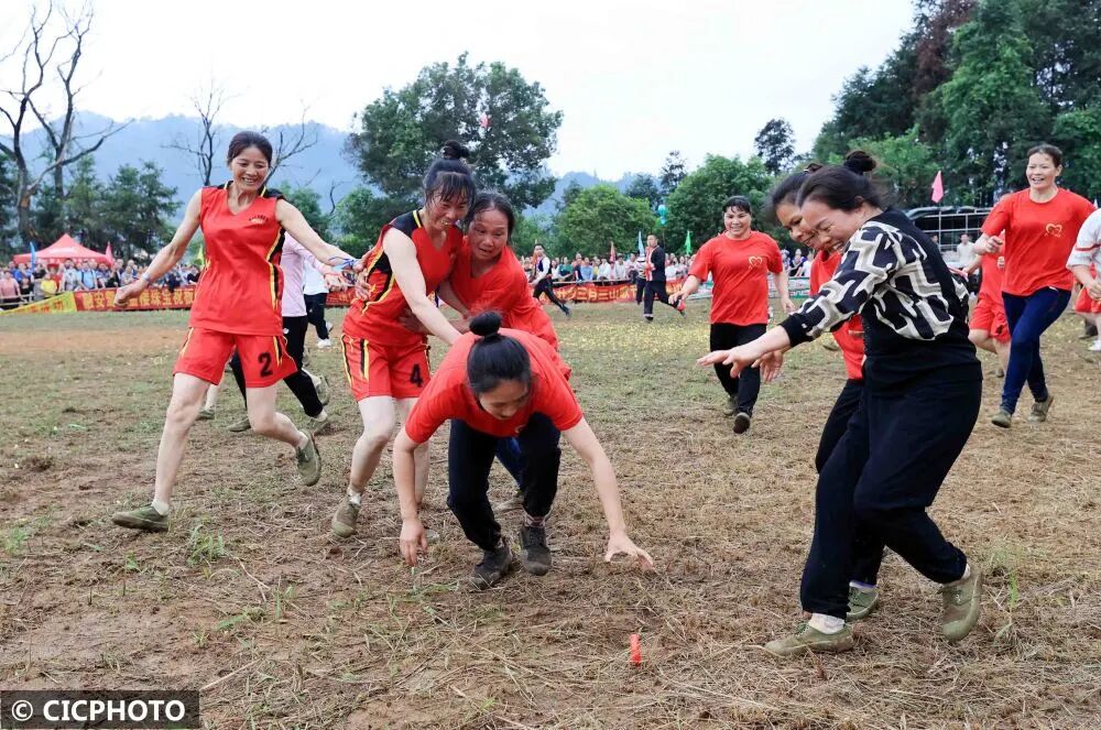 2023年4月22日,在广西柳州市融安县板榄镇举办的“板榄三月三会期”民俗活动中,女队员在抢花炮。