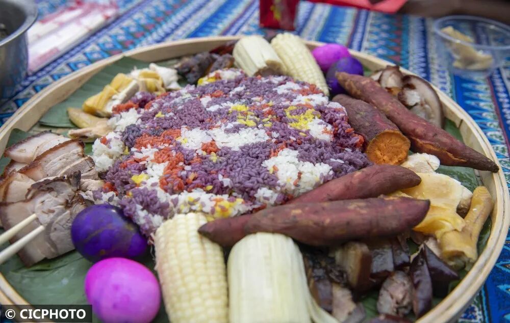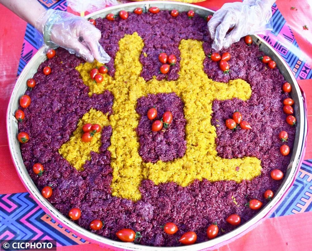 2023年4月22日,在广西桂林市恭城瑶族自治县文武广场举办的“喜庆三月三 民族一家亲”主题民俗活动中,瑶族同胞展示“五色糯米饭”拼盘。