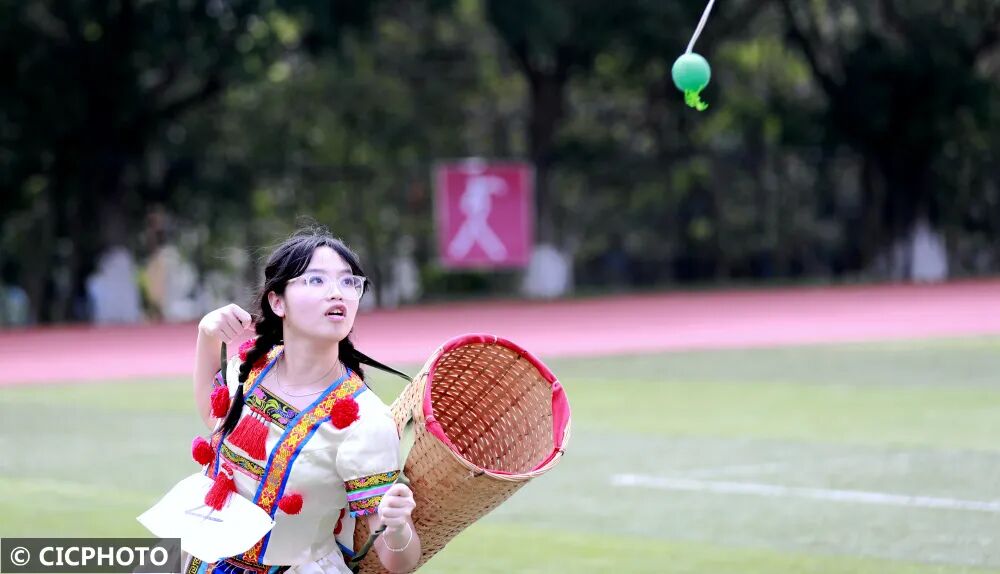 2023年4月18日,广西崇左市扶绥县,在桂林理工大学南宁分校第三届少数民族传统体育运动会上,大学生参加背篓绣球比赛。