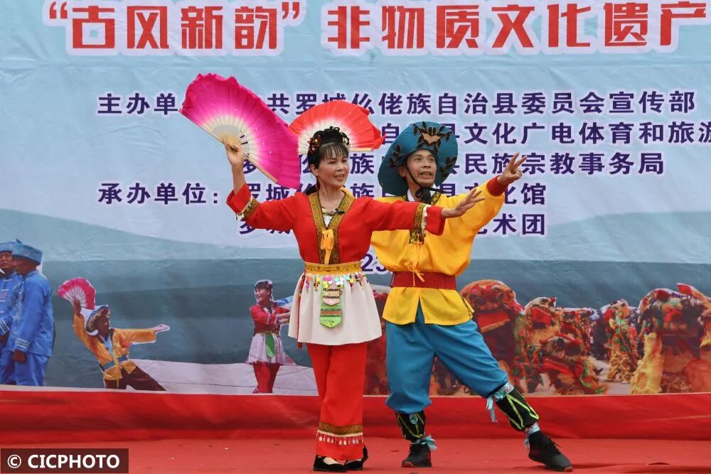 2023年4月22日,广西河池市罗城仫佬族自治县成龙湖走坡广场,演员在表演彩调。
