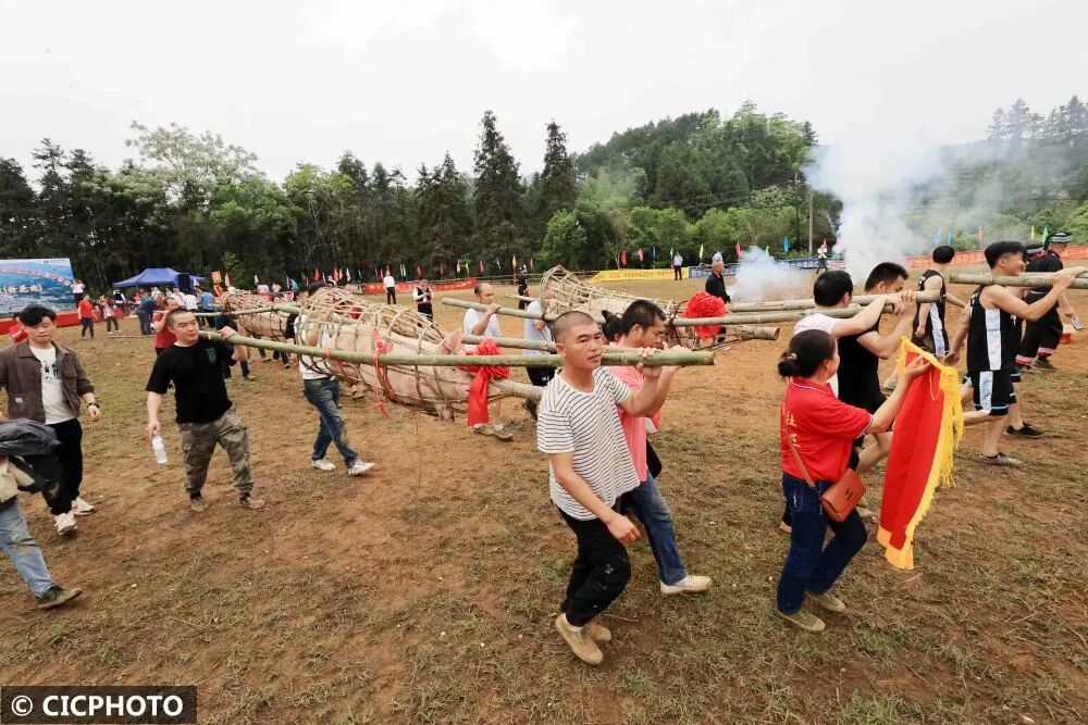 2023年4月22日,在广西柳州市融安县板榄镇举办的“板榄三月三会期”民俗活动中,抢花炮获胜的村民在抬运奖品活猪回村。