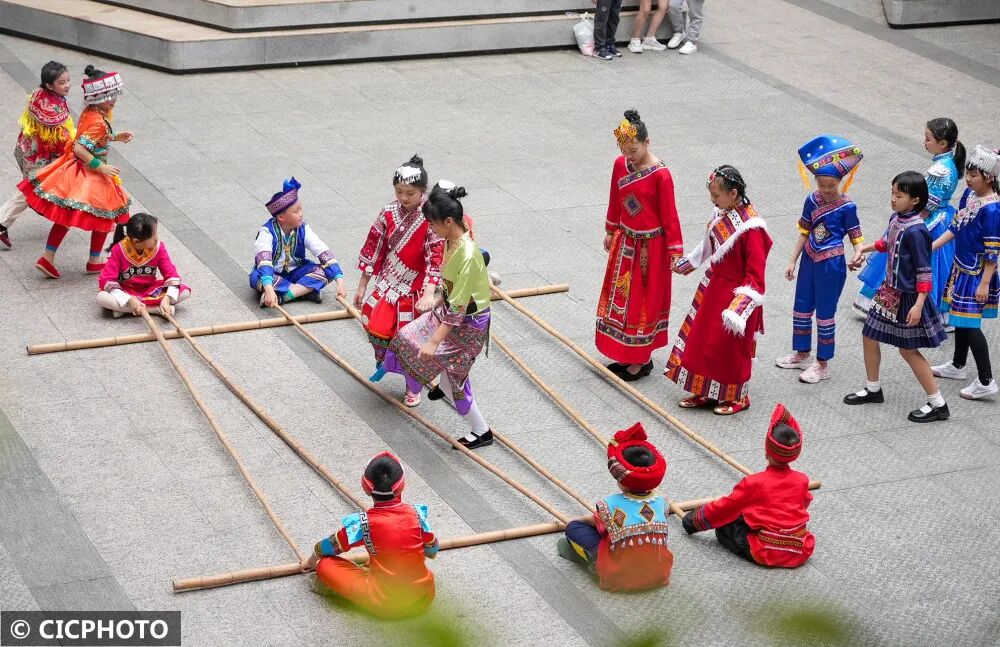 2023年4月17日,广西桂林市榕湖小学举行“壮族三月三 传承民族情”民族文化主题教育活动,师生们在跳竹竿舞。
