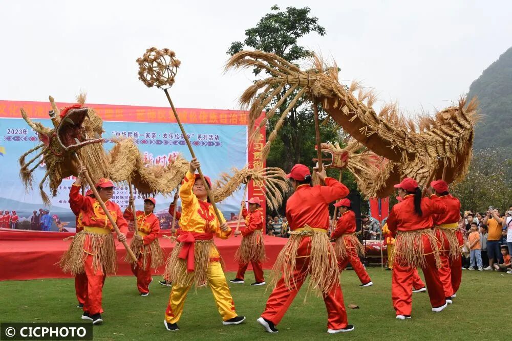 2023年4月22日,广西河池市罗城仫佬族自治县成龙湖走坡广场,舞龙队在展演仫佬族舞草龙。