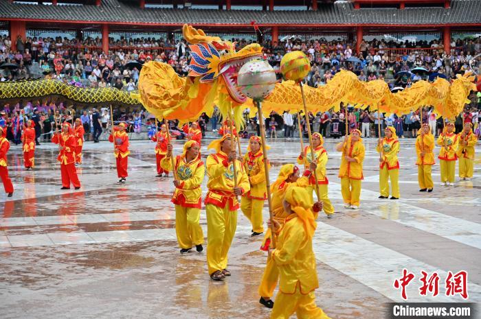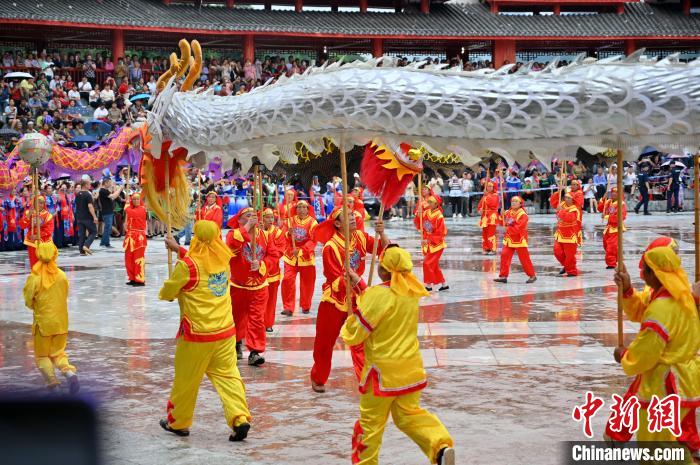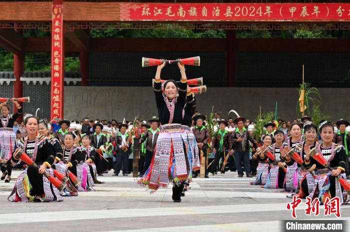 6月21日,中国唯一的毛南族自治县——广西河池市环江毛南族自治县举办传统民族节日“分龙节”。游人欢聚一堂,体验中国毛南族独具特色的民俗文化盛宴。图为民俗表演。中新社记者 俞靖 摄