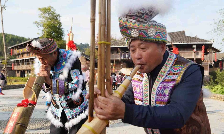 12月10日,融水杆洞驻融芦笙队来到融水梦呜苗寨开展“打同年“活动。“打同年“是融水苗族自治县一带苗族同胞的民族习俗。“打同年“是苗族村寨之间开展的联谊活动。