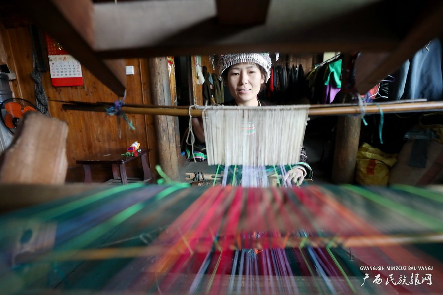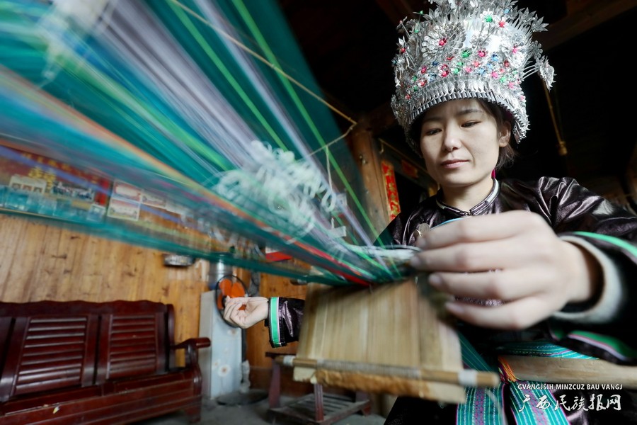 1月28日,一名苗族妇女在三江侗族自治县八江镇布代村织锦。春节将至,当地少数民族妇女抓紧赶制民族服装,喜迎新春到来,尽展侗乡民族服饰多彩魅力。(通讯员 龚普康)