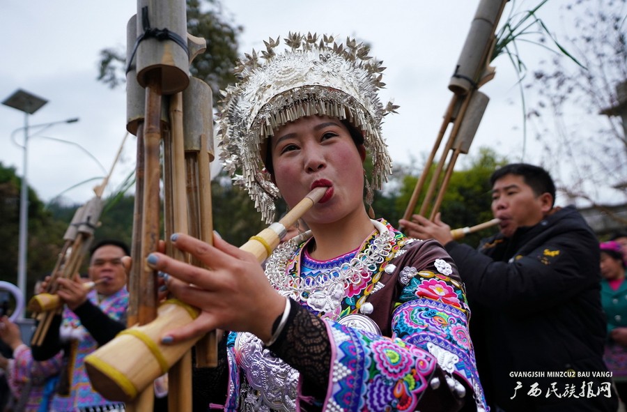 2月27日,在融水苗族自治县香粉乡古龙坡,苗家汉子在吹奏芦笙。