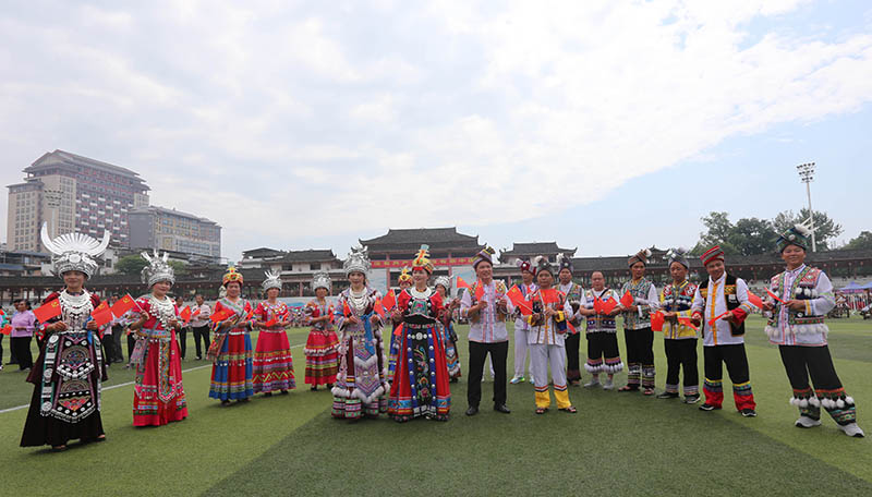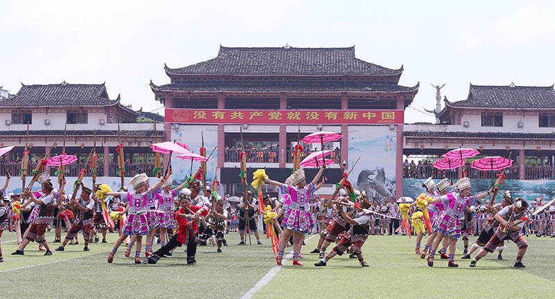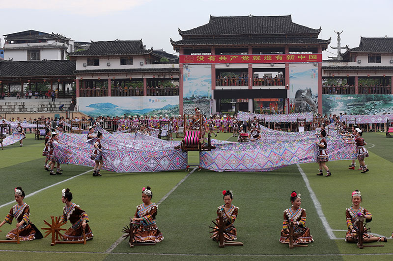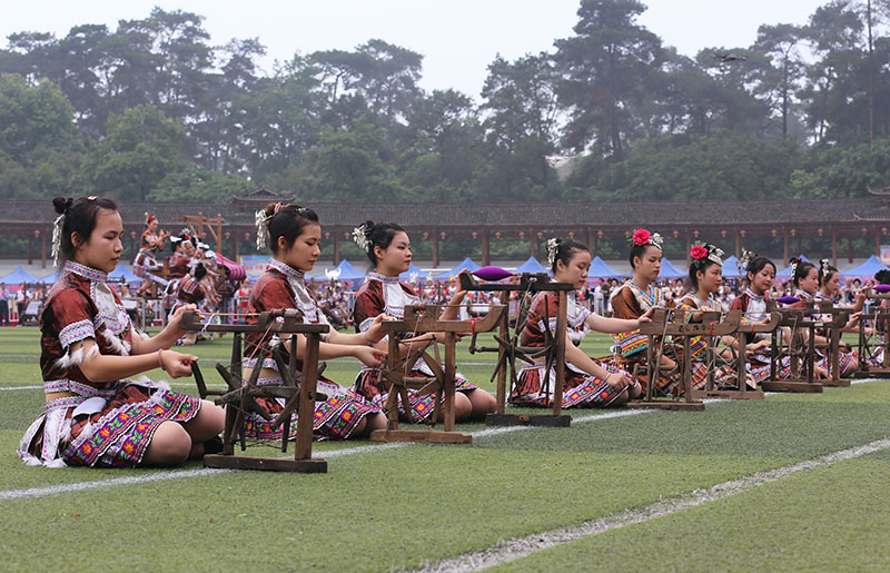 6月12日,融水苗族自治县举办第一届民族文化大集市活动,活动现场,100台织布机穿梭飞舞,苗族拳术表演,多民族山歌颂党恩,民族团结一家亲芦笙舞表演活动轮番上演,向现场和线上的观众充分展示了融水非遗文化的独特魅力,以线上、线下相结合的方式展示当地非遗项目。
