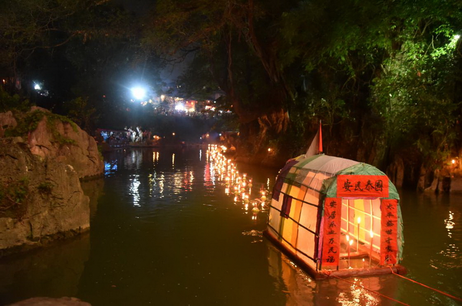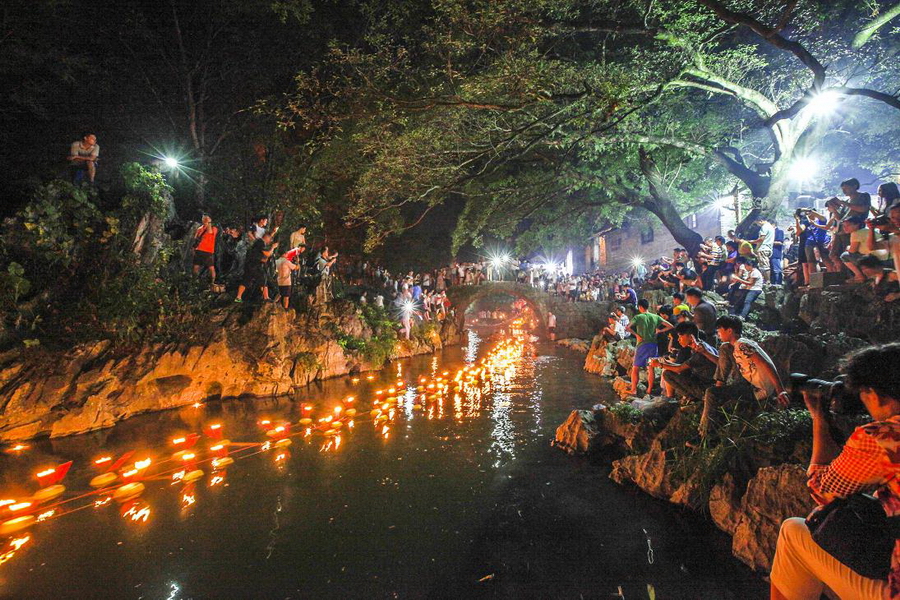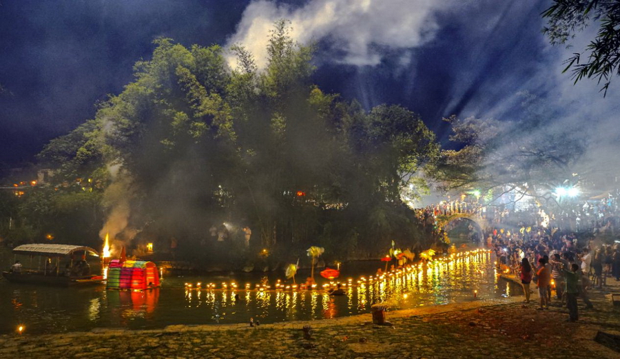 每年农历的七月十四至七月十五,是黄姚古镇非常重要的日子,媲美过年的节日——柚子灯节。柚子灯由龙头和龙身组成,龙头有对联:太平盛世千家乐,安居乐业万民福,横联——国泰民安。龙身由点上蜡烛与香火的众多柚子条形组成,形如龙身龙尾。节日晚上举办的活动非常热闹,双狮领路,龙翔姚江,祈福国泰民安。