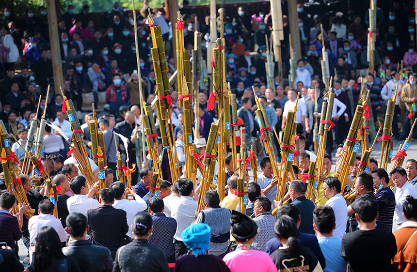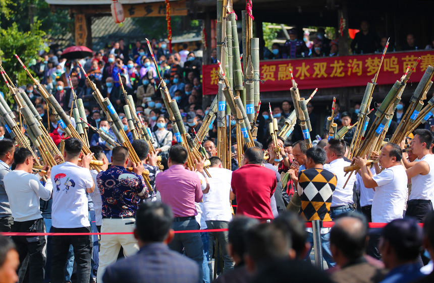 人民网融水11月29日电 近日,广西融水苗族自治县双龙沟梦呜苗寨举行第二届“芦笙狂欢节“,来自周边村寨的苗、瑶、侗等少数民族芦笙队展开芦笙比响活动。据了解,芦笙比响就是比声音大小,声音大者即为胜方。场外裁判远在1公里外的高山上听声音,并用旗语将比赛结果通知参赛者和场内裁判。