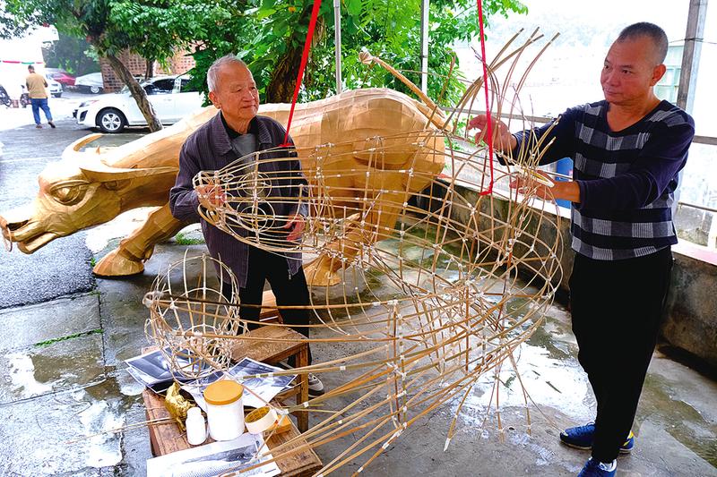 在他家门口,摆放着一个长约3米,栩栩如生的“小金牛“花灯,仿佛在蓄力往前奔跑,尾巴高翘,活灵活现。一位邻居路过时,不禁由衷地发出赞叹:“这太像了,得小心点,会‘咬人’哦!“黎炳生老人今年已经80多岁高龄,从20岁开始学习扎花灯。他能编扎各种类型的花灯,最早是传统的花篮灯、宫灯,后来,随着黎老花灯制作手艺越来越精湛,无论是惟妙惟肖的飞禽走兽灯、花鸟鱼虫灯,还是切合时代主题的飞机、火箭等特型灯,黎炳生都能“变“出来。2017年,黎炳生被评为自治区级非物质文化遗产项目(南宁元宵花灯节)代表性传承人。