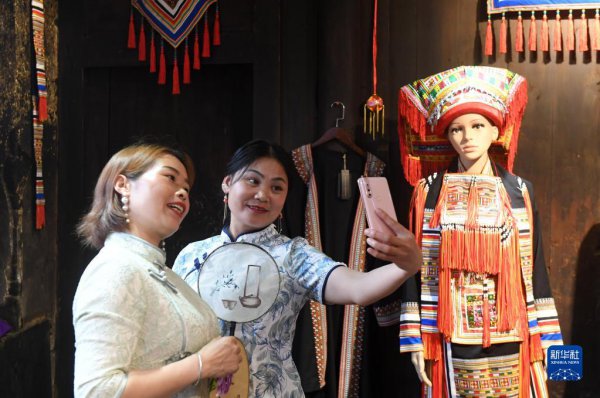 在广西贺州市富川瑶族自治县朝东镇秀水村,两名游客在参观民族服饰。 在广西贺州市富川瑶族自治县朝东镇岔山村,当地村民为游客展示民族纺织技艺。 3月13日,一名游客在广西贺州市瑶族...