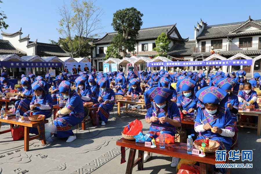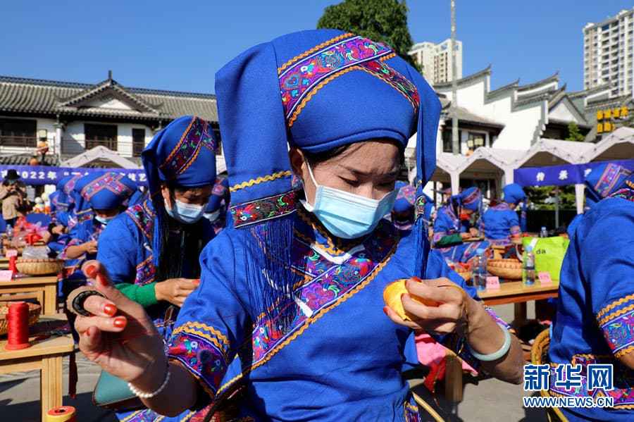 绣球传吉祥,壮锦织新天。日前,在广西靖西市锦绣古镇广场上,123名绣娘身着壮族传统服饰,整齐排座,熟练地穿针引线,缝制绣球。