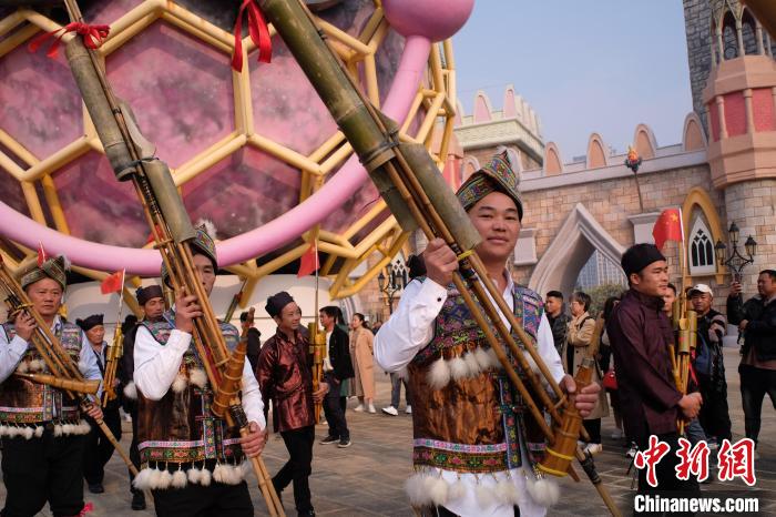 图为参赛选手手捧大芦笙绕场展示。刘俊聪 摄12月30日,“同心筑梦,‘笙’声不息”2024年元旦芦笙舞大赛在广西柳州市克里湾欢乐世界进行。来自广西三江、融水以及贵州等地的139支芦笙队参加比赛,苗族、侗族等多民族民众同聚共吹芦笙,并跳起欢快的舞蹈,洪亮的乐声响彻天际。芦笙是中国西南地区苗族、侗族、瑶族民众喜...