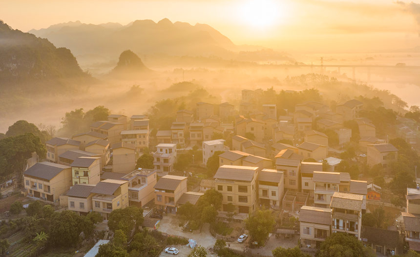 图为珠连村木州屯晨景宁明县珠连村位于世界文化遗产——左江花山岩画文化景观内。近年来,该村依托花山岩画这一世界级名片和秀美的自然风光,结合村内的天然冷泉、百年古树林等资源,大力发展乡村旅游,带动当地及周边群众500多户发展现代农业采摘、乡村民宿等乡村旅游业,吸纳当地群众务工350余人,人年均增收2800余元...