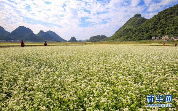 柳州市柳城县古砦仫佬族乡独山水库库区的荞麦花海; 游客在柳州市柳城县古砦仫佬族乡独山水库库区的荞麦花丛中跳舞; 在柳州市柳城县古砦仫佬族乡独山水库库区,荞麦花迎风绽放; 游客在柳州市柳城县古砦仫佬族乡独山水库库区的荞麦花丛中游玩; 游客在柳州市柳城县古砦仫佬族乡独山水库库区的荞麦...