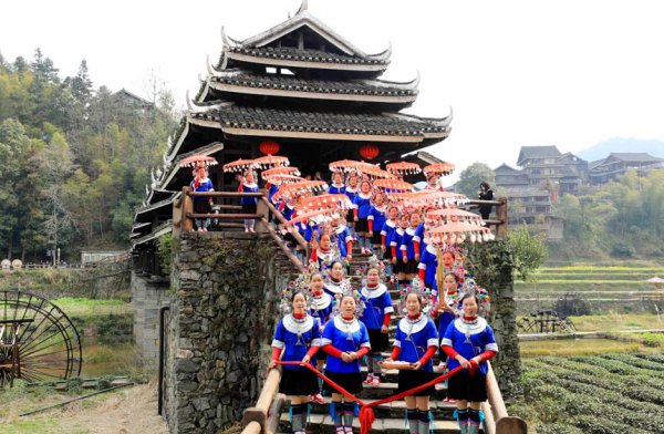 在广西柳州市三江侗族自治县林溪镇的程阳八寨,村民身着民族盛装在风雨桥头迎接游客。 村民身着民族盛装在风雨桥头迎接游客。 少数民族妇女送上拦门酒。 少数民族妇女送上拦门酒。 广...