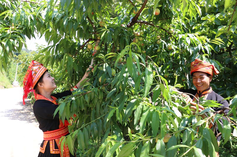 村民正在采摘油桃。