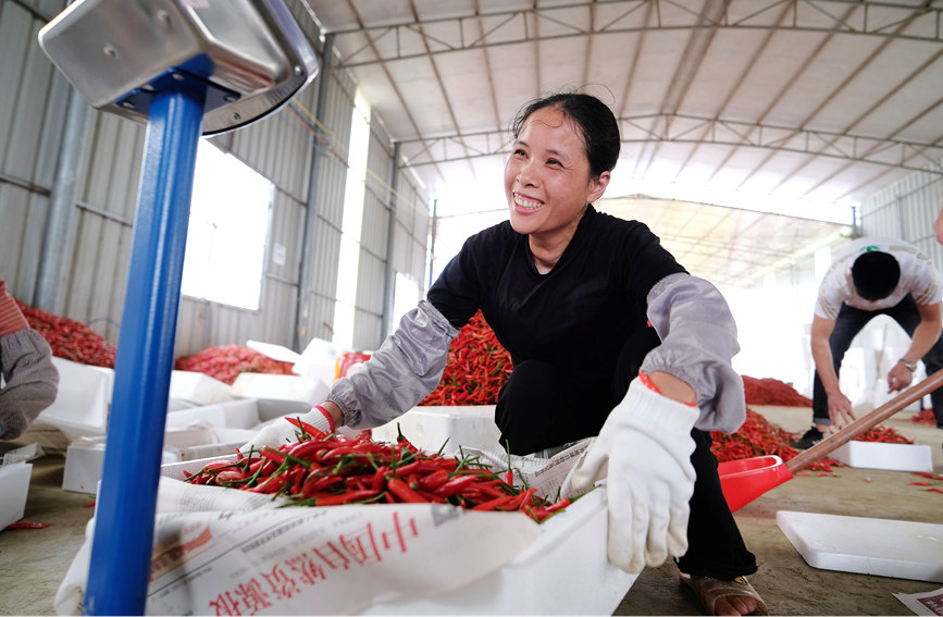 村民在辣椒基地采摘辣椒。张晓冬摄