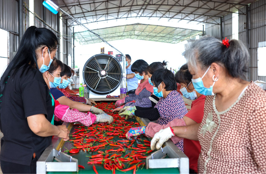 人民网钦州6月7日电 时下,正值指天椒采摘旺季,在广西为农指天椒种植有限公司500亩辣椒园内,农户们将刚采摘好的辣椒从田间地头运到加工厂,从晾干、挑选到包装运输,现场一派热火朝天的景象。