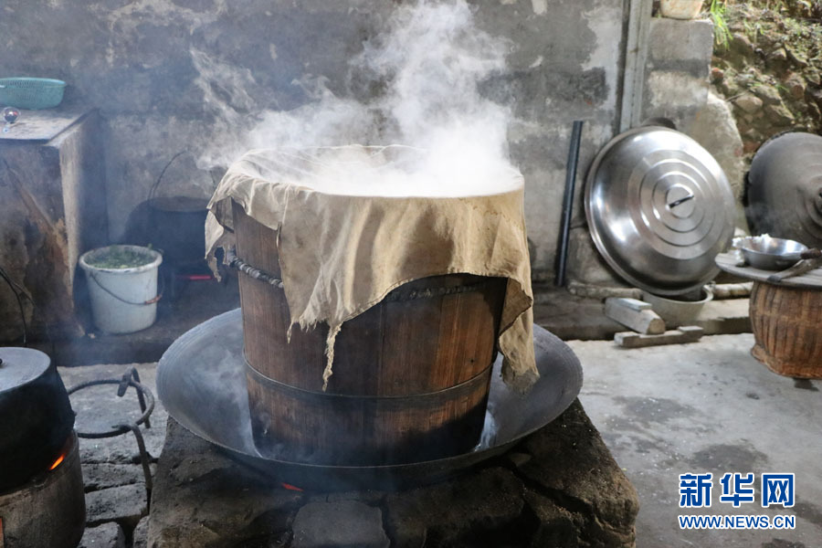 清晨6点,大湾村村民邹顺煌家就燃起了炊火,母亲正在烧水,准备蒸当天的第一锅糯米团。邹顺煌和父亲则在庭院里洗着工具,为打糍粑做准备。上好的糯米经水淘洗、浸泡后,被放入甑子里蒸熟,趁热倒入石臼中,准备正式开“捶”。