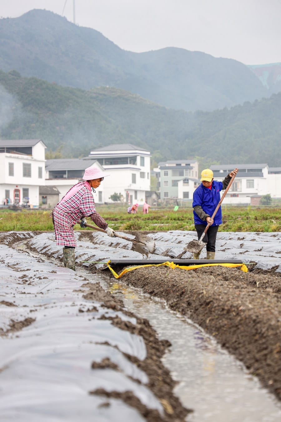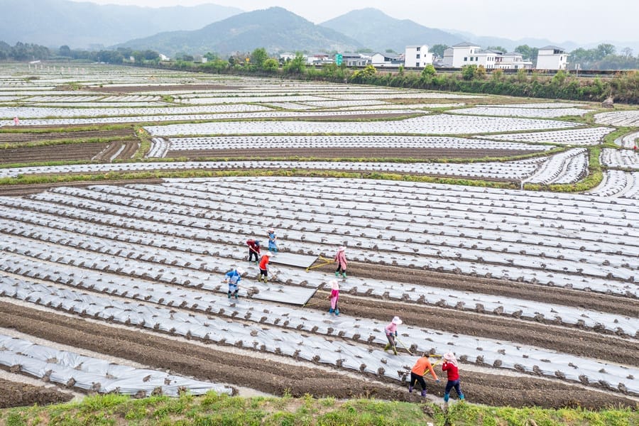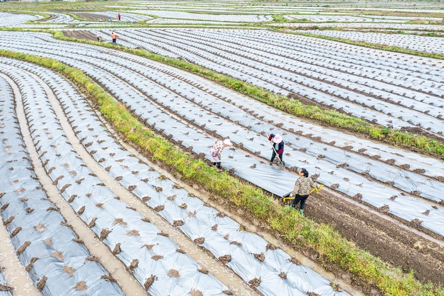连日来,在广西贺州市钟山县凤翔镇新栗村委东林村,芋农们在香芋种植基地里忙着覆盖地膜。放眼望去,连片的香芋田仿佛被镶上串串银链,构成了一幅生机勃勃的春耕画卷。