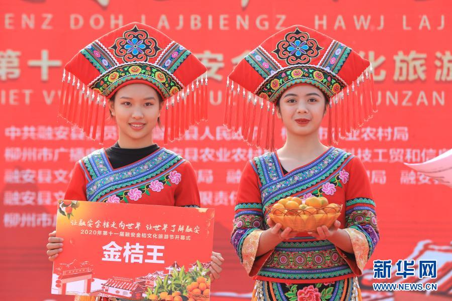 12月12日,在柳州市融安县“金桔选美“比赛现场,工作人员在展示“金桔王“。