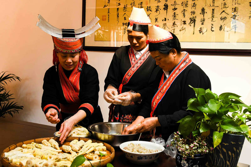 把肉馅儿包进竹笋里。金秀瑶族自治县融媒体中心供图