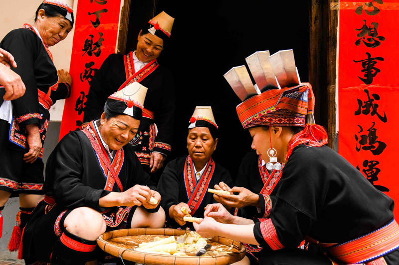 村民们用牙签将竹笋划成笋丝。金秀瑶族自治县融媒体中心供图
