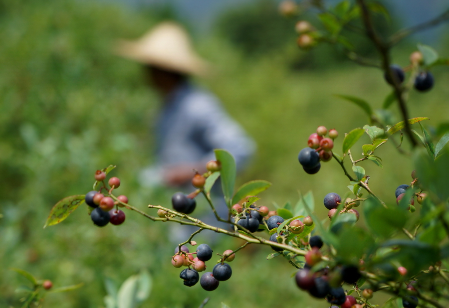 7月6日,在广西柳州市融水苗族自治县白云乡高兰村,一名村民在采摘高山蓝莓。
