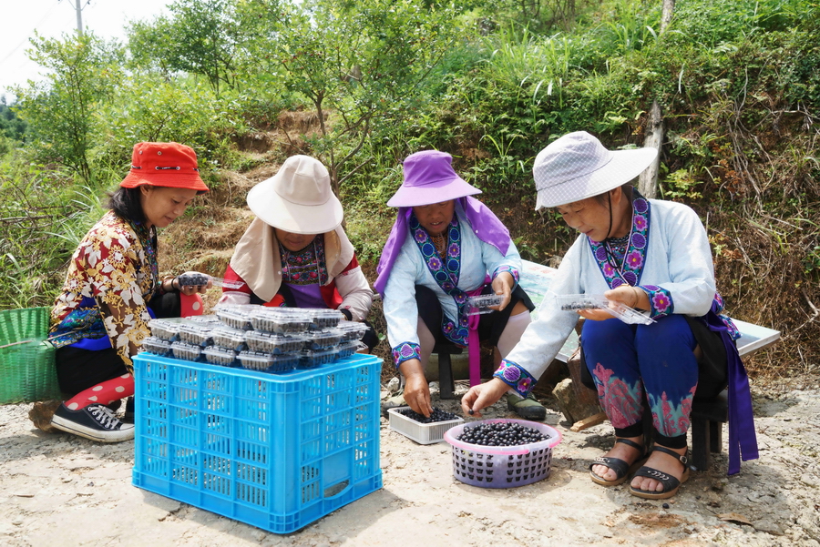 7月6日,在广西柳州市融水苗族自治县白云乡高兰村,苗族妇女在分拣刚采摘高山蓝莓。