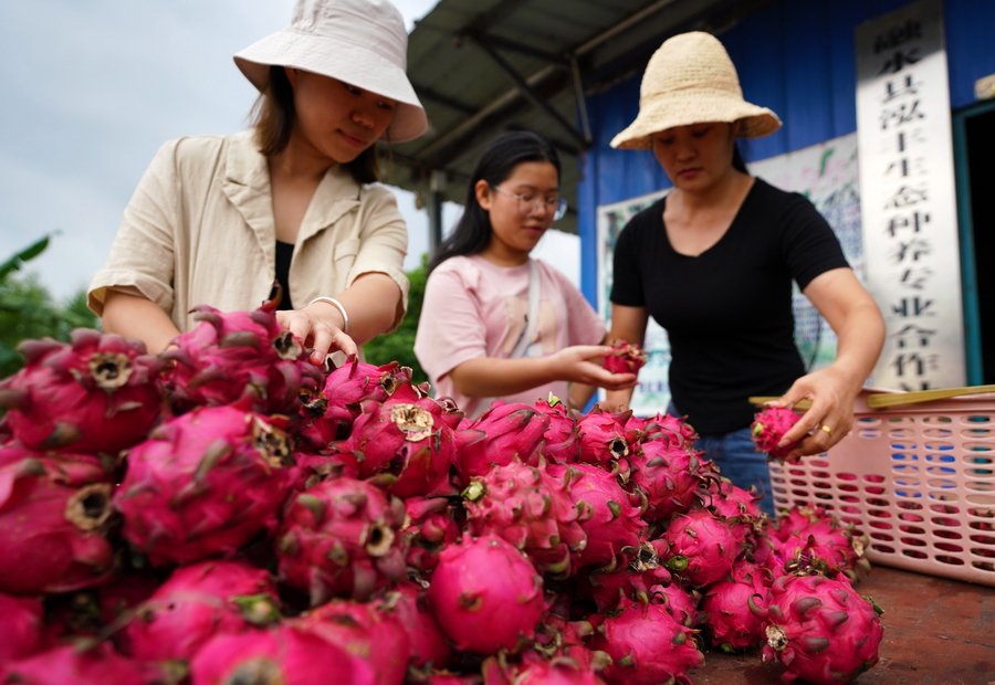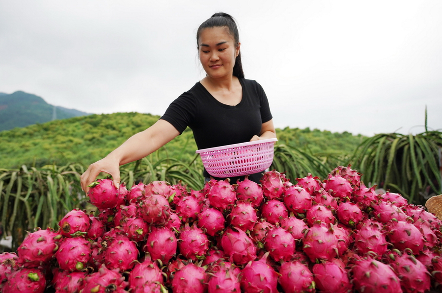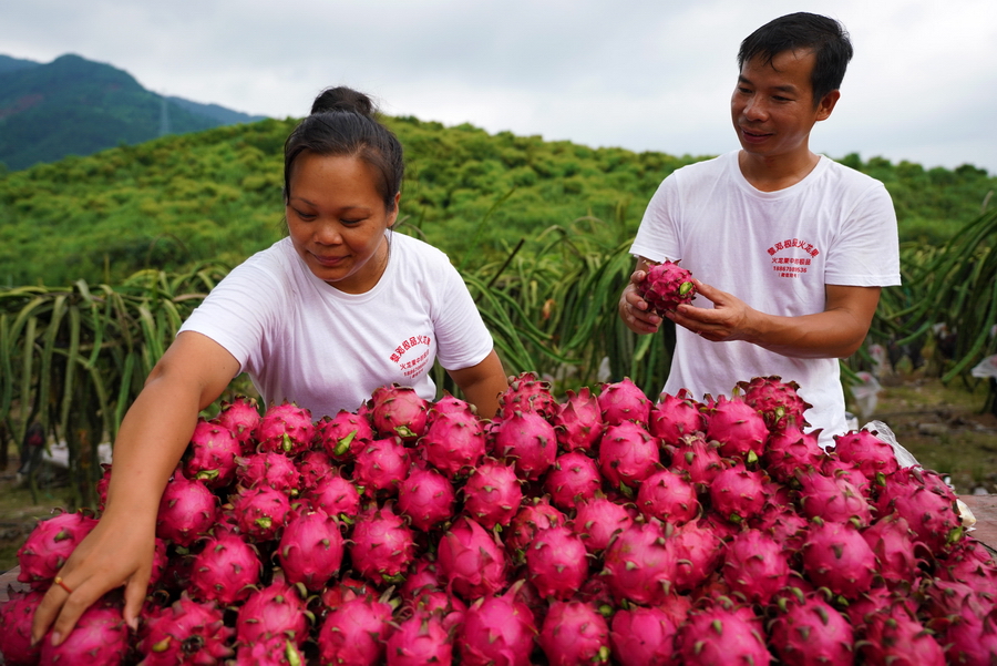 8月22日,在融水苗族自治县融水镇三合村黎邓火龙果基地屯,果农在整理火龙果。