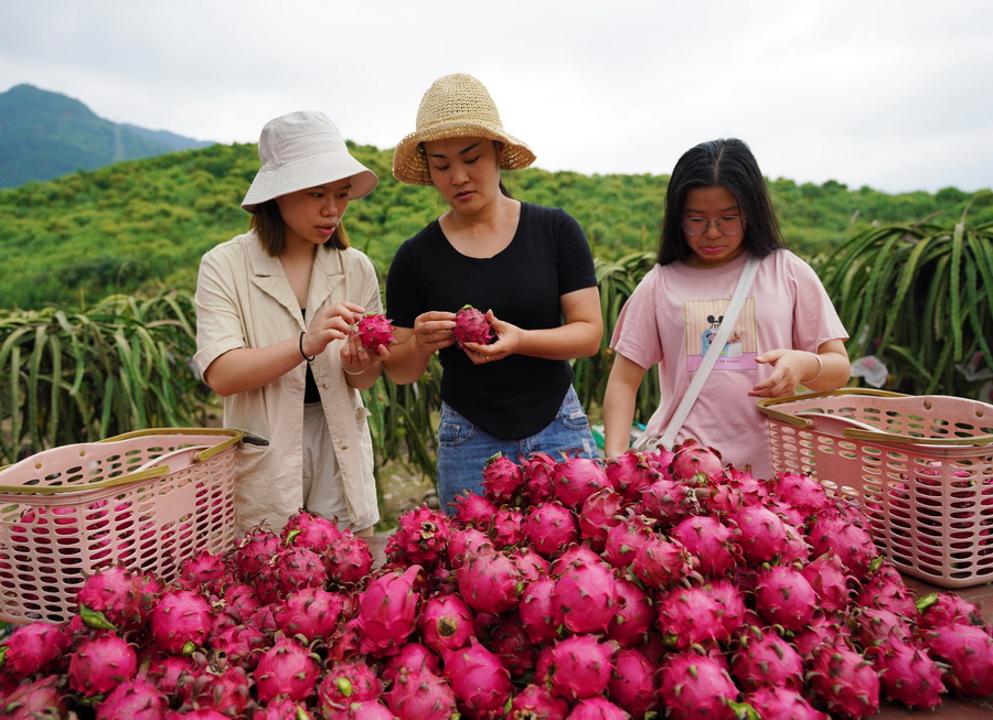 8月22日,在融水苗族自治县融水镇三合村黎邓火龙果基地屯,游客在选购火龙果。