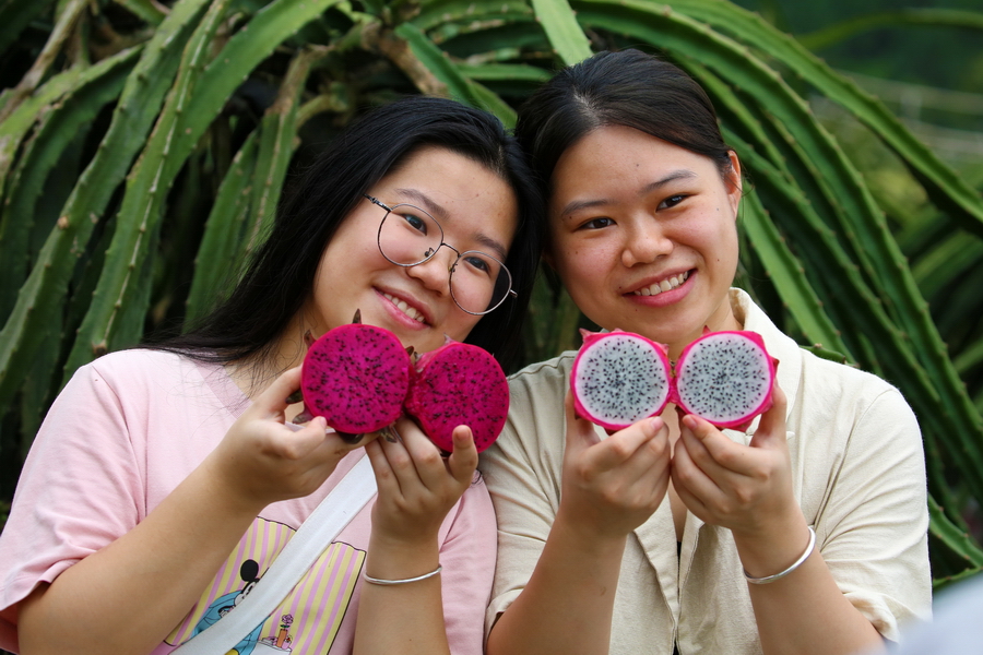 8月22日,在融水苗族自治县融水镇三合村黎邓火龙果基地屯,游客在展示刚切开的果龙果。
