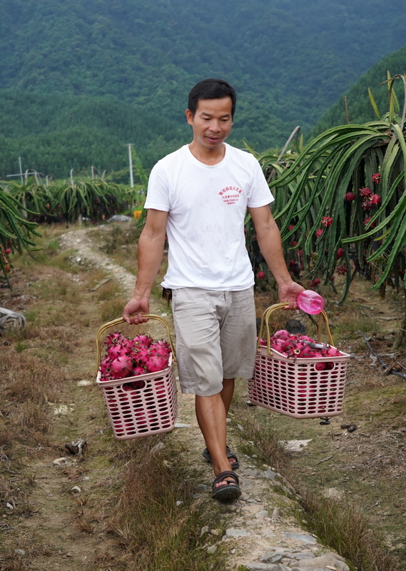8月22日,在融水苗族自治县融水镇三合村黎邓火龙果基地屯,果农在搬运刚采摘的火龙果。
