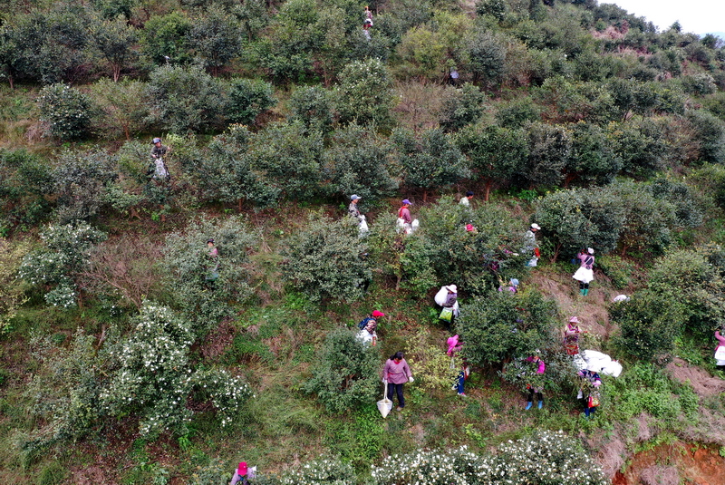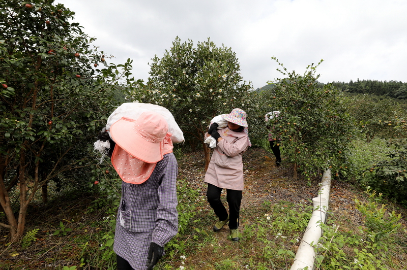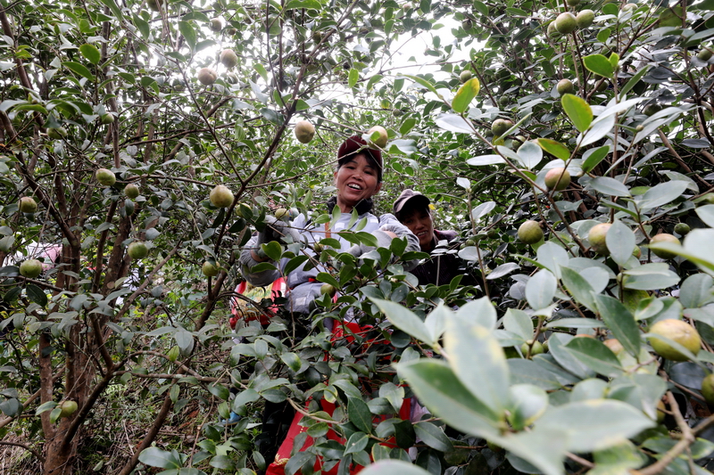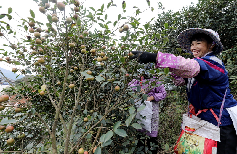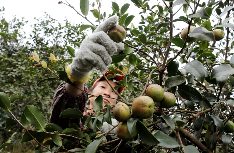 10月21日,三江侗族自治县斗江镇思欧村宇塘油茶示范基地村民在采收油茶鲜果